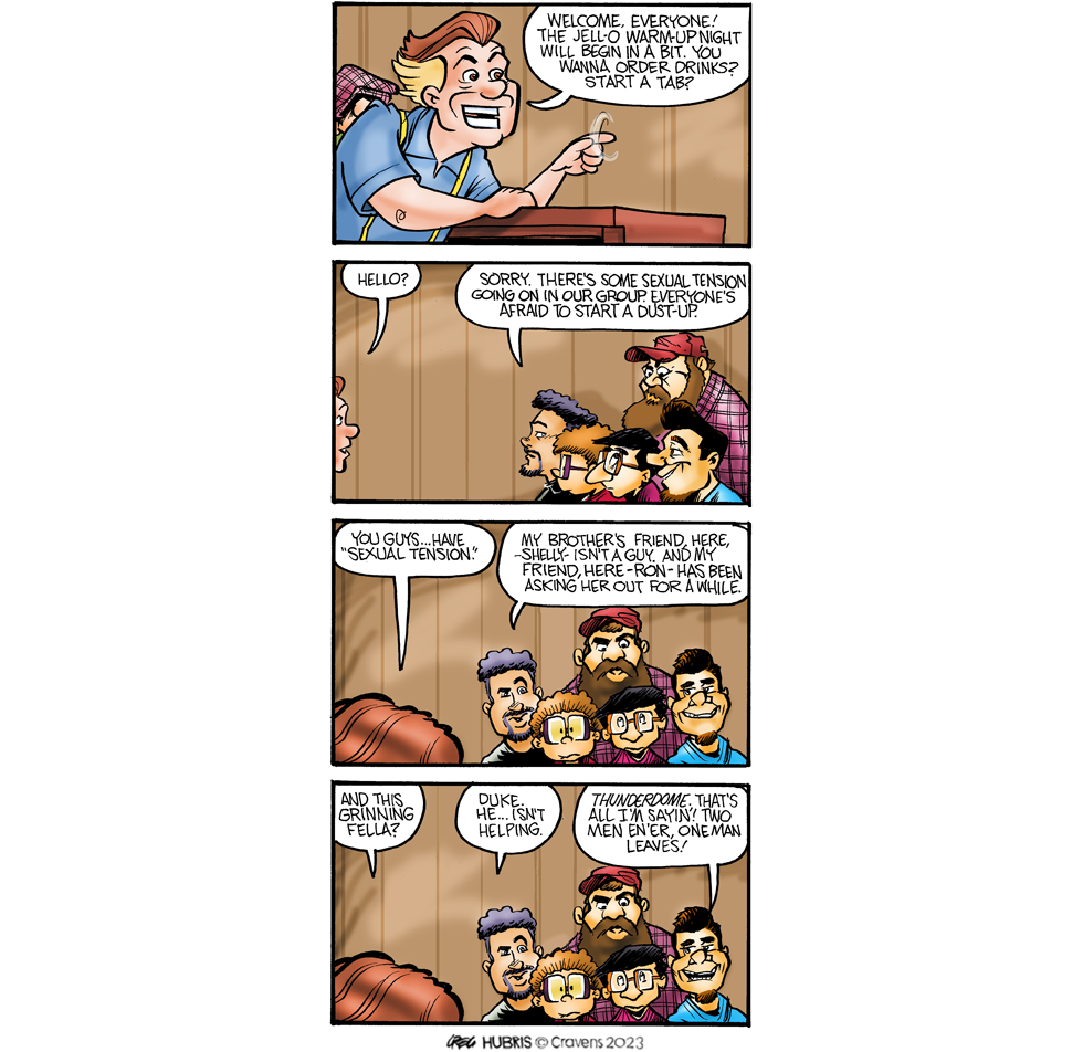 Duke is an instigator. I mean, remember his team at The Great Stanky Creek OutdoorFest? It wasn’t called “Them Duke Boys” for nothing. He instigated that, and then stirred up trouble until it was just easier to keep that name than any of the others that people wanted. He laaauuuughed about that! And now, he’s trying to get Mal beat up and Ron possibly locked up. He probably hasn’t thought it that far through… probably just got as far as “I bet I can start a fight between the biggest guy here and the smallest guy here” and let it rip at that.